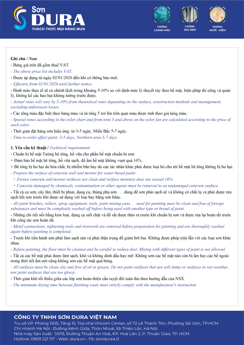 TẢI BẢNG GIÁ SƠN DURA TRỰC TIẾP CHỦ ĐẦU TƯ 2026: TẠI ĐÂY
